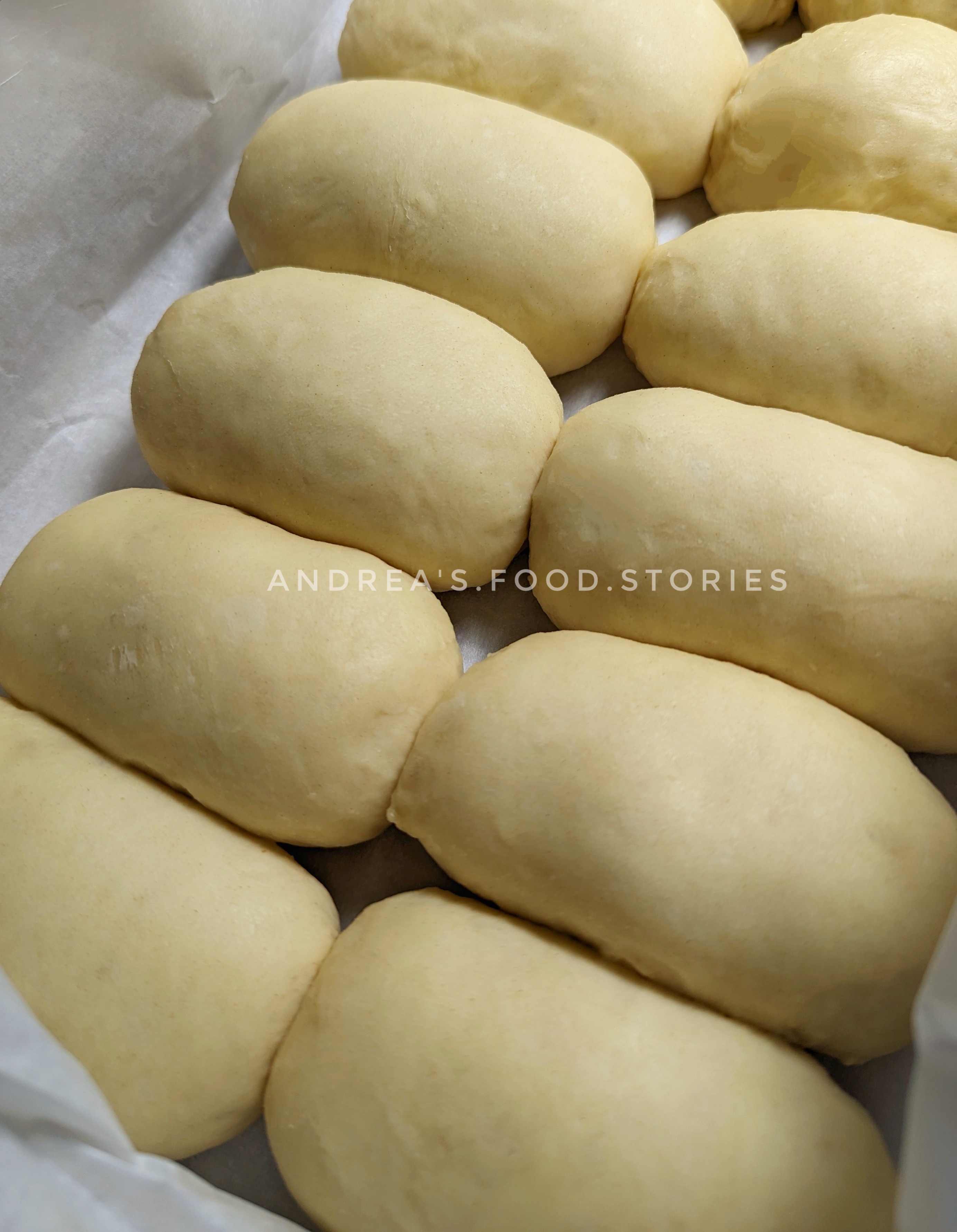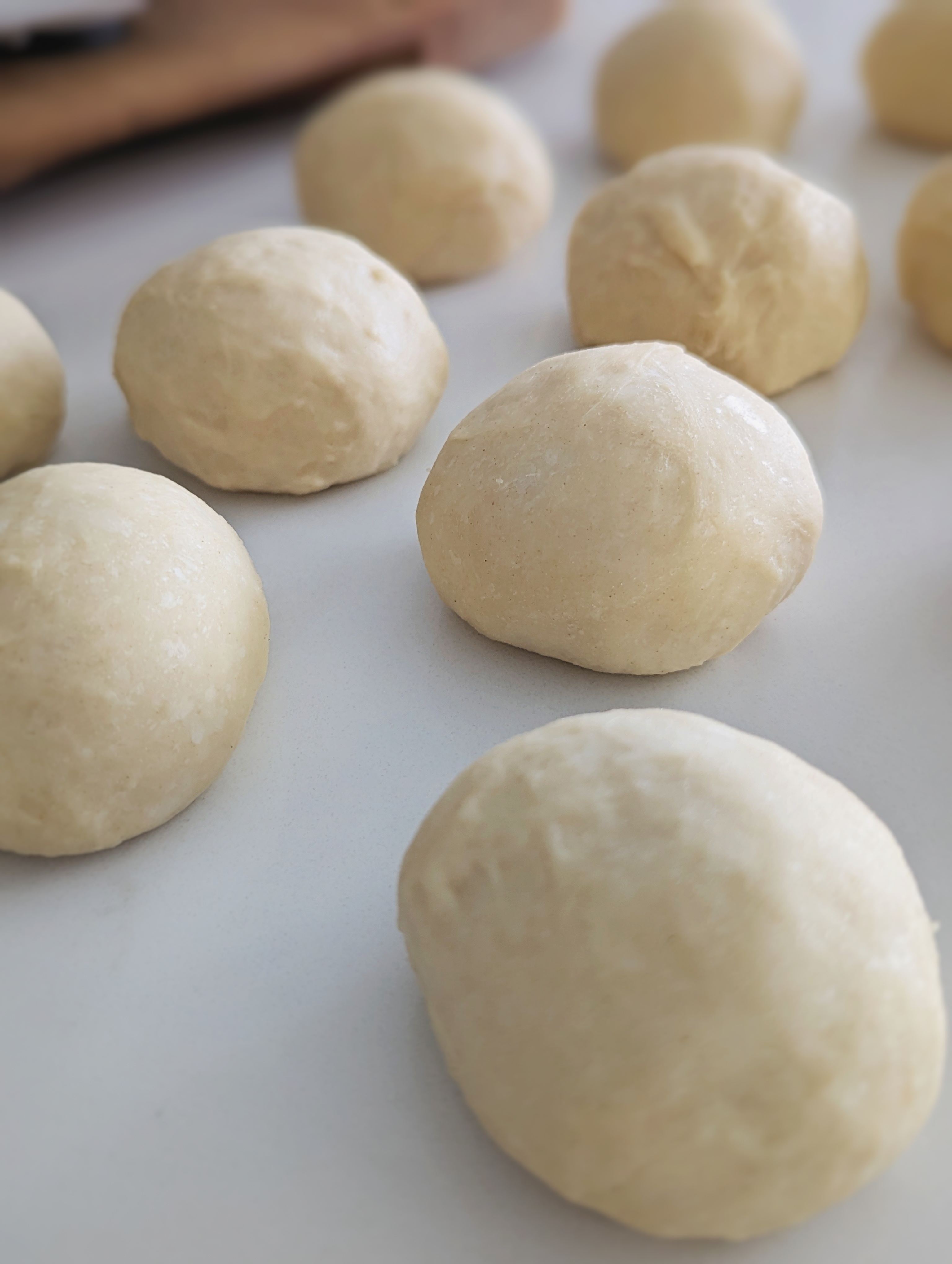 - After the initial proofing of the dough, portion it into 12 equal parts. I typically weigh the total dough and then divide it by 12 to approximate the size of each bun.